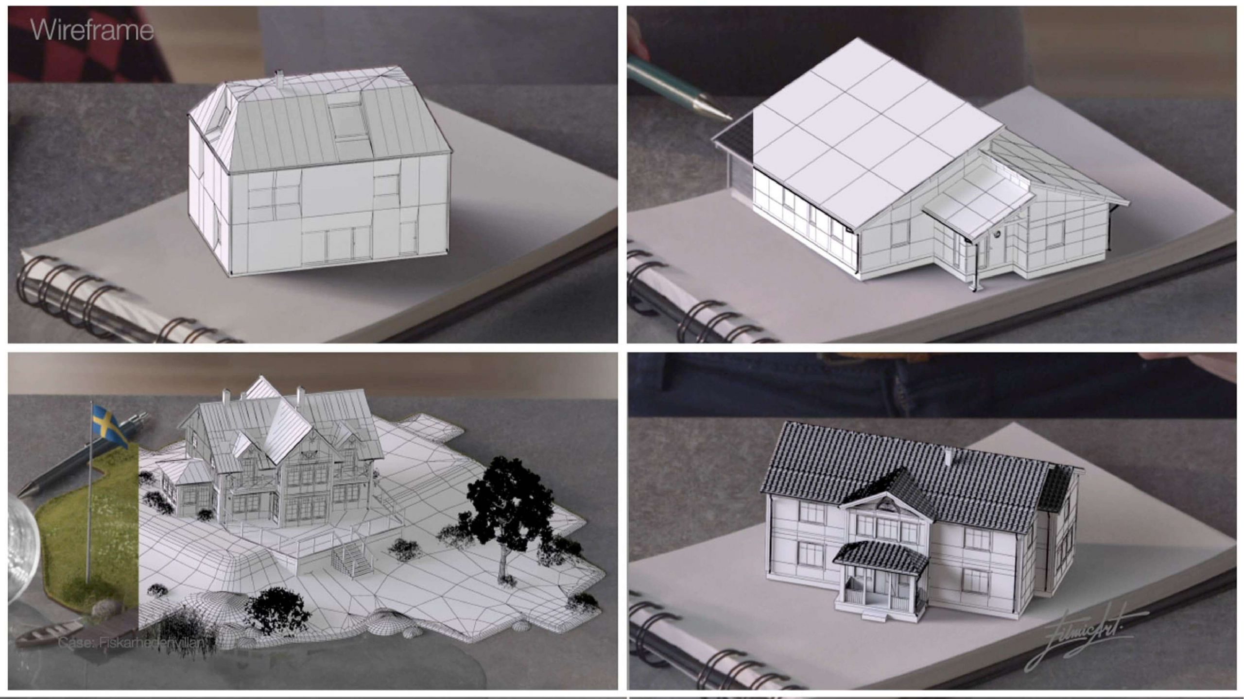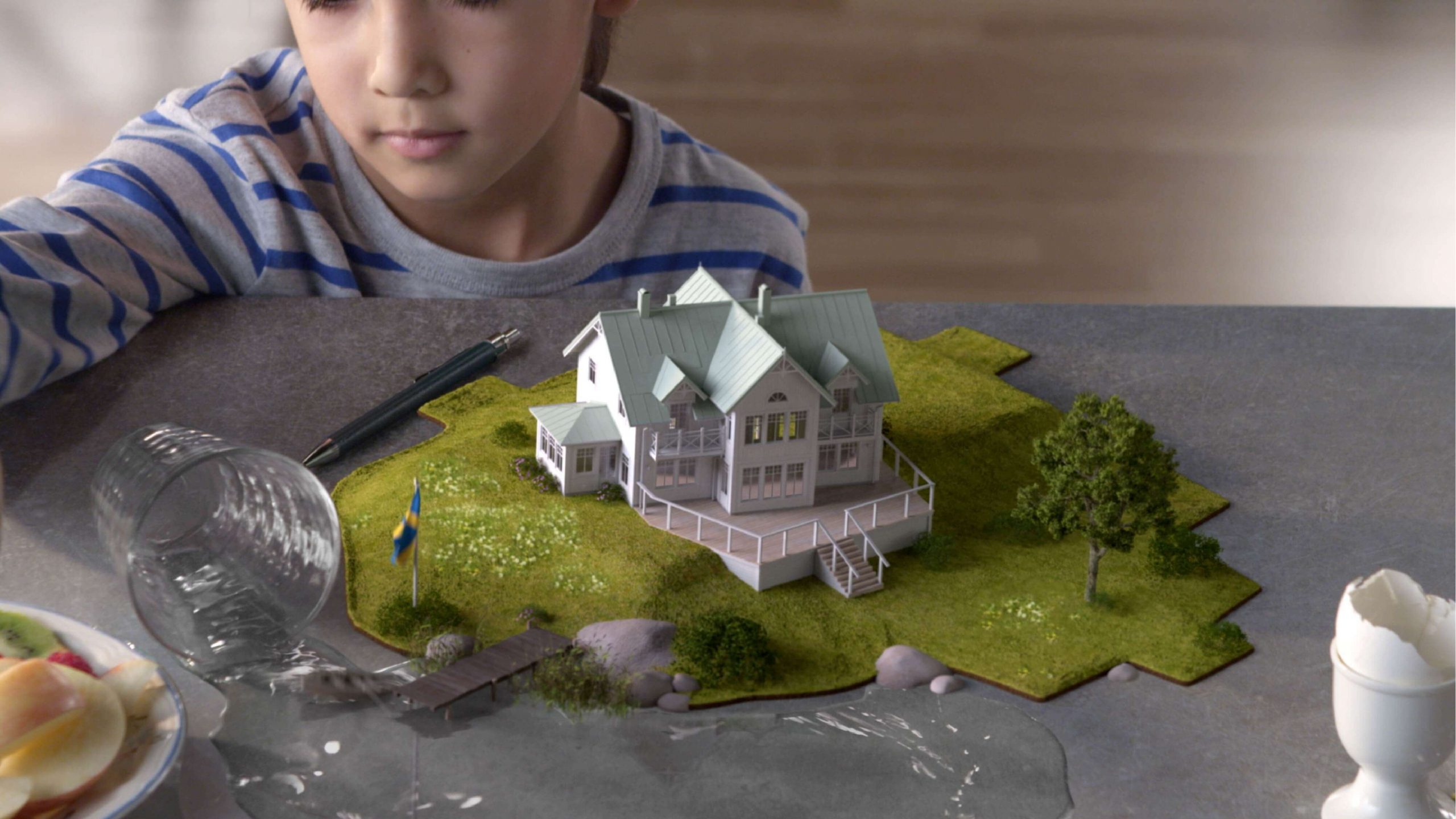 I Fiskarhedenvillans första TV-kampanj någonsin ville de att några av deras husmodeller (de säljer nyckelfärdiga hus) skulle synas i filmen som utspelar sig kring en familjs frukostbord. För att få de 3D animerade “minihus”-modellerna att kännas på riktigt, så byggde vi skalenliga modeller i grönpapp som vi sedan trackade med s.k. object tracking, en teknik där man även får med rörelserna av 3D-objekten. En annan fördel var att vi fick känslan att statisterna faktiskt håller i våra 3D-hus då tekniken gör att rörelserna i 3D-modellen följs perfekt och resultatet blir en mer integrerad upplevelse mellan det filmade materialet och 3Dn.