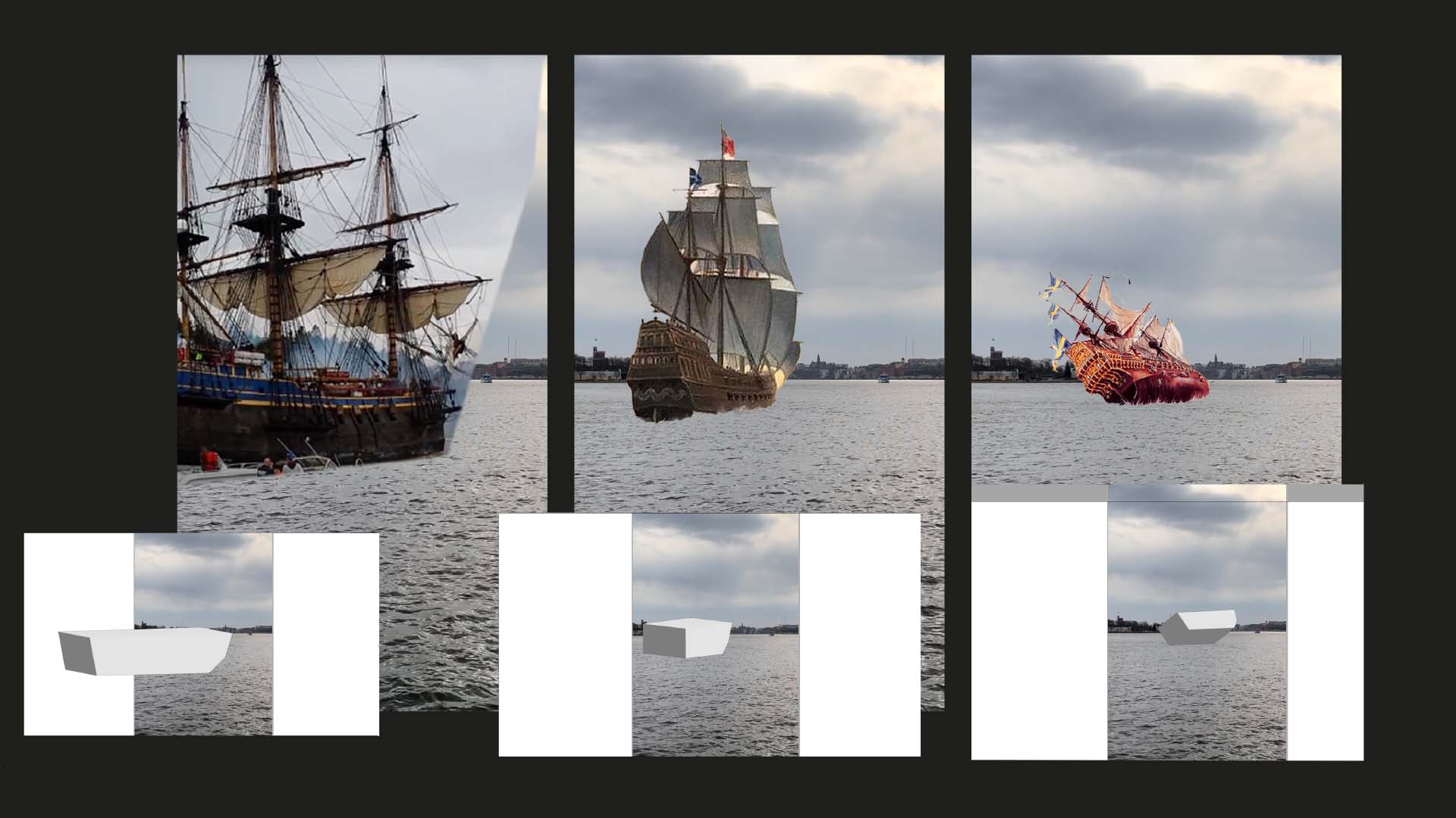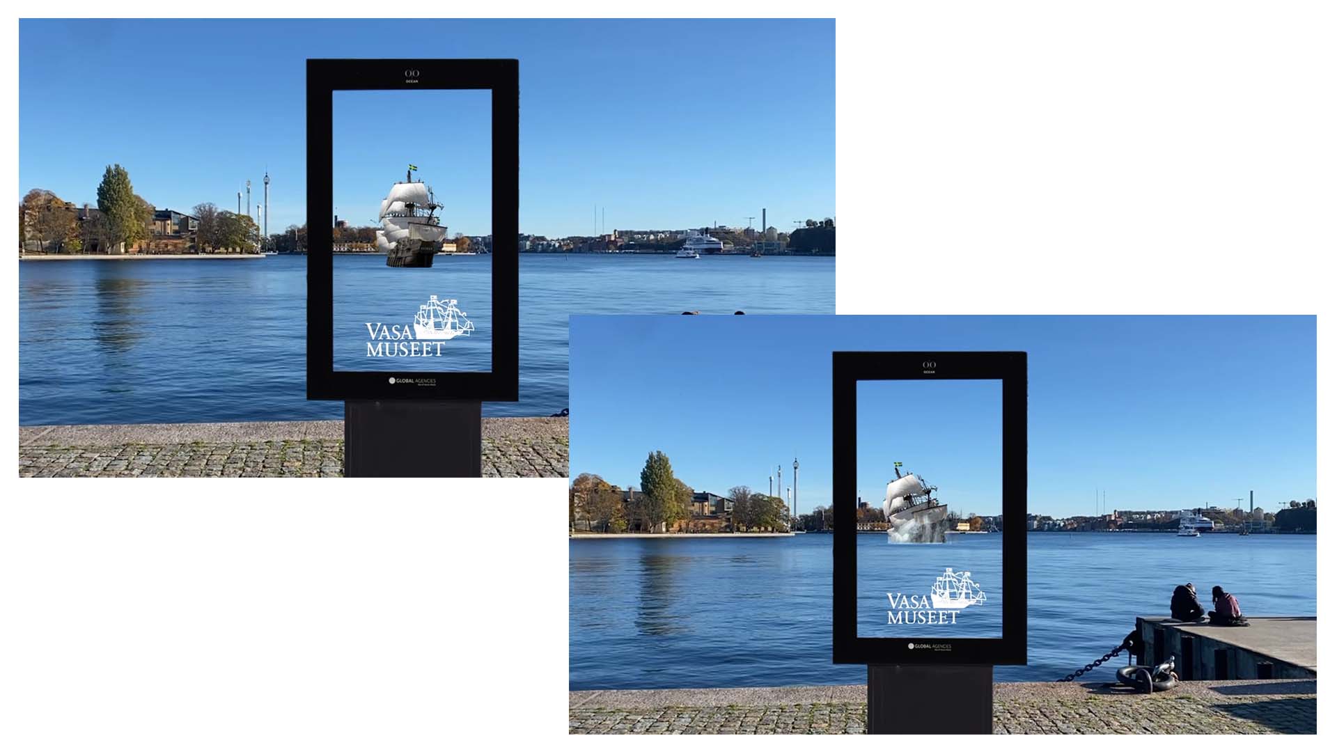 Vasamuseet fick möjligheten att fylla en av Ocean Outdoors skärmar med valfritt innehåll och kontaktade oss för att genomföra sin briljanta idé. Skärmen är placerad på andra sidan vattnet till museet. Så tanken är att det ska se ut som att man ser igenom skärmen och att Vasaskeppet åker in i bild och sedan förliser. Skeppet är gjort i 3D och förliser på samma sätt som det gjorde i verkligheten.